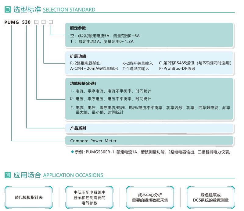 PUMG530系列三相智能电力仪表具有精确的电力参数测量功能,仪表采用先进的ARM处理器和数字信号处理技术设计而成;集三相电参量测量、显示、电能统计、电能质量分析、数字输入/输出及网络通讯于一体;具有精度高、隔离性强、性能稳定、抗干扰能力强等优点。该仪表还有很强的扩展功能,如监视外部开关动作、4~20mA模拟量输出,还可以通过RS-485通讯实现仪表的网络化管理。