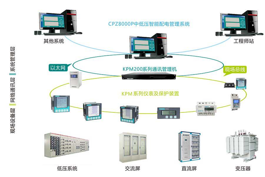 CPZ8000P中低压智能配电管理系统采用分层、分布式结构设计,按间隔单元划分、模块化设计,整个系统分为三层:系统管理层、网络通讯层、现场设备层。