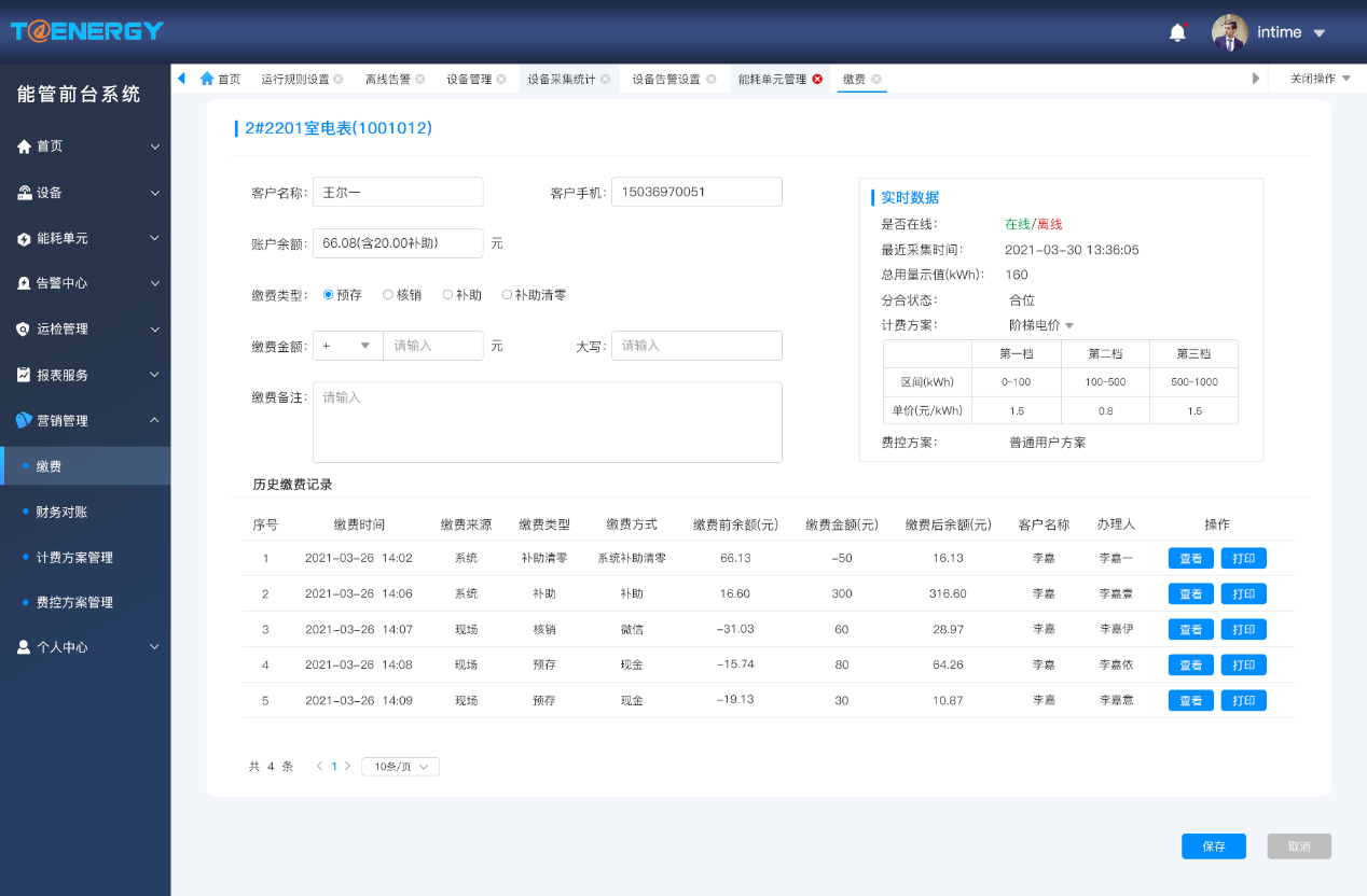 研发的系统可帮助物业公司实现对各地物业的出租商铺、办公室的电费预付费管理,也适用于学生宿舍电费管理。租户预存电费,余额不足系统通过短信提醒,租户通过微信、支付宝、等方式自助充值。系统自动统计已充电费、已用电费、剩余电费并形成财务报表,实现预付费系统的自动化运行。