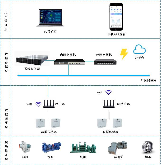 项目方案设计应用智能传感、物联网、移动通讯、大数据分析和人工智能技术等先进技术。在关键设备表面安装振动、温度等智能采集硬件,智能采集设备通过厂区Wifi网络,将数据上传至本地服务器/云服务器,实现关键设备运行状态数据实时采集;平台端进行数据处理与存储,实现设备状态实时显示、异常智能预警、数据分析、操作记录、报表统计等设备状态监测业务。