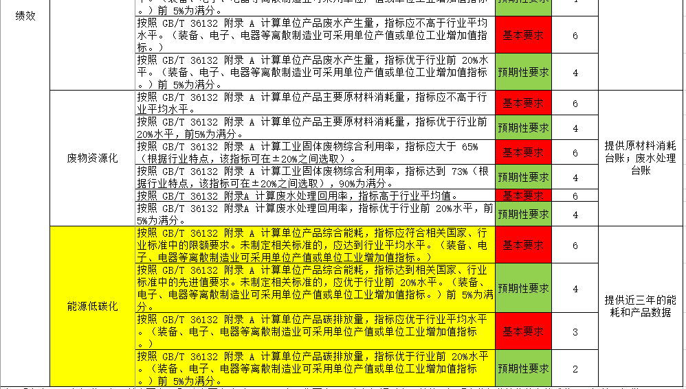 从认证评价表中可以看到与基本要求和预期性要求等相关要求,绿色工厂通过与否,并不是完全看分值的高低,基本要求项都必须满足的基础上再看总分值。其中与能源管理相关的主要有以下几方面的内容: