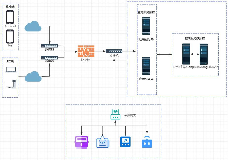 多端(PC、移动端)通过局域网路由器和交换机等网络设备访问服务器,服务器及时响应数据,应用服务器和数据服务器采用2个节点的高可用部署。