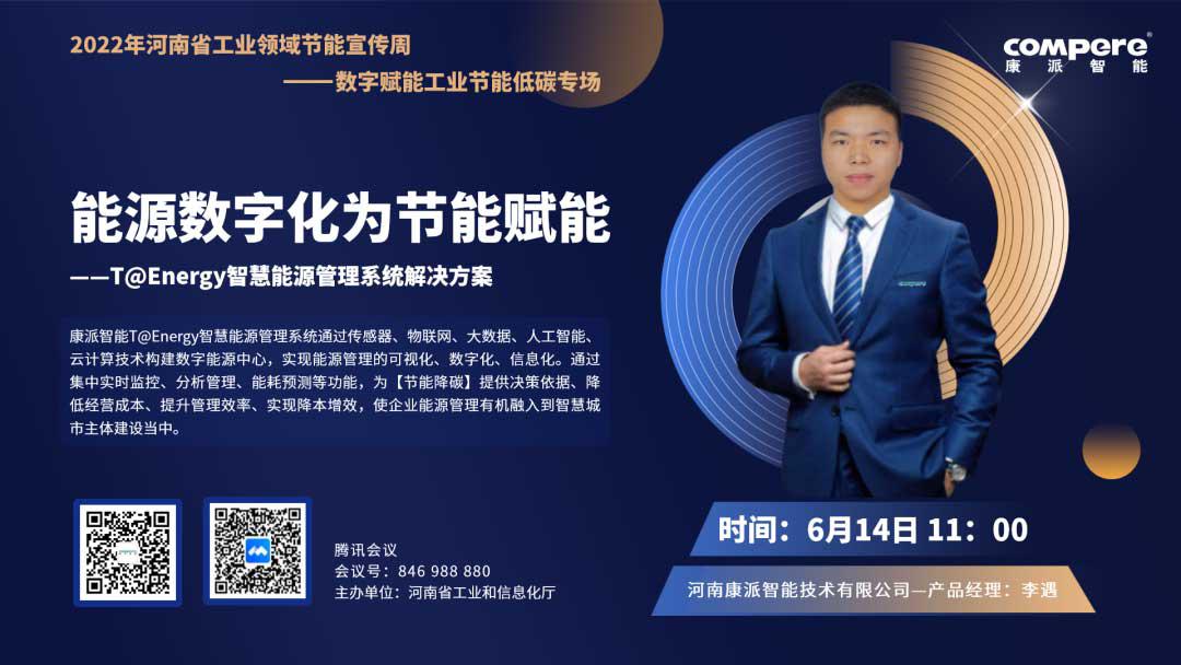 2022年6月,响应国家发改委与河南省工信厅“节能宣传周”活动要求,澳门金沙娱乐官网积极响应,主动配合完成数字赋能工业节能低碳专场活动,以线上宣传的方式,向社会及工业企业完成主题为《能源数字化为节能赋能--T@Energy智慧能源管理系统解决方案》的宣讲活动。