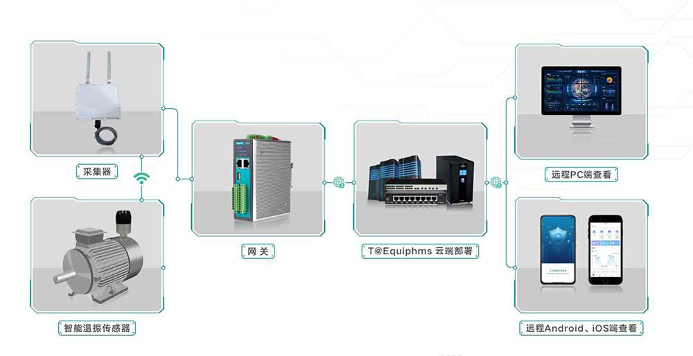 设备健康管理系统,在振动的基础上,增加了与旋转类设备相关的数据采集,通过对重点设备的综合分析,给用户提供设备维护的综合方案。系统主要组成如下: