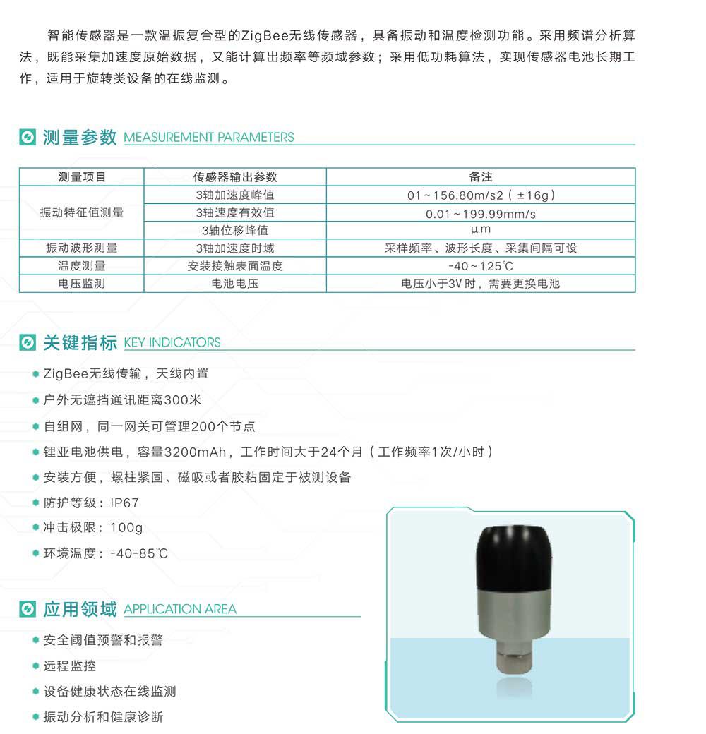 通过无线温振一体的传感器和配套网关实现工业设备运行状态的数字化精确采集和安全传输。通过Zigbee无线传输方案,涵盖无线传输距离从50米至300米的广范围覆盖,设备端无需部署电缆网线,安装成本只有数据有线采集方案的1%,精准便捷,广泛适用于各类工业设备的智能化升级的后装和前装市场。