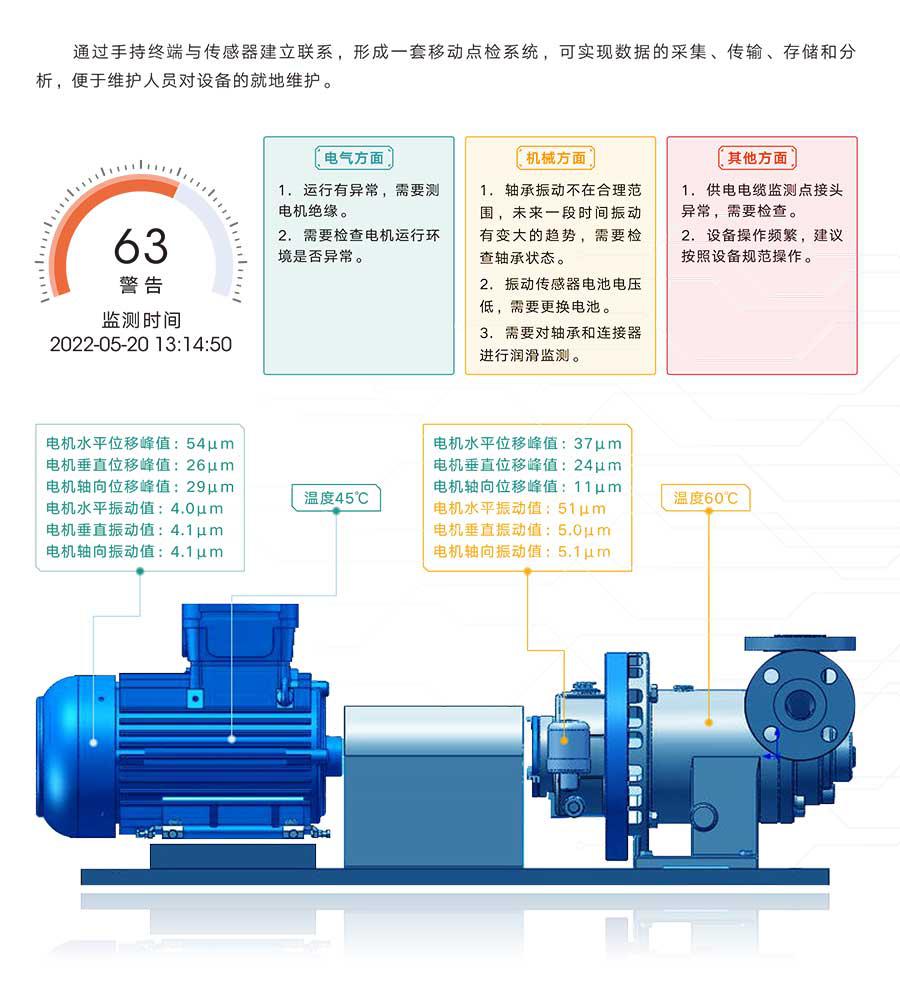 设备健康管理系统,在振动的基础上,增加了与旋转类设备相关的数据采集,通过对重点设备的综合分析,给用户提供设备维护的综合方案。