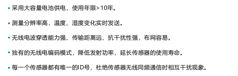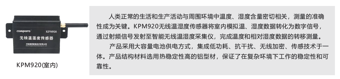 KPM920无线温湿度传感器将室内模拟温、湿度数据转化为数字信号,通过射频信号发射至智能无线温湿度采集仪,完成温度和相对湿度数据的转移测量。