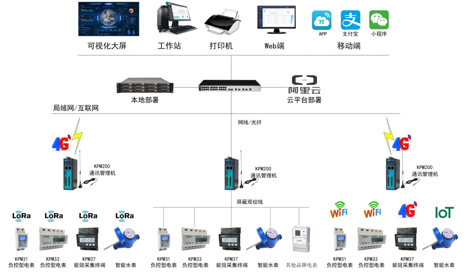 预付费管理系统采用分层分布式结构,前端使用智能电表等计量设备实时监测用电数据,通讯管理机将数据上传至云平台/本地服务器进行数据加密处理,通过云平台/本地服务器将加密数据上传至预付费系统后台,实现线上仪表与监控主机的数据连通,完成电能管理系统和收费管理系统功能。现场设备层,除了挂接智能电表外,还可以对接智能水表、气表等。