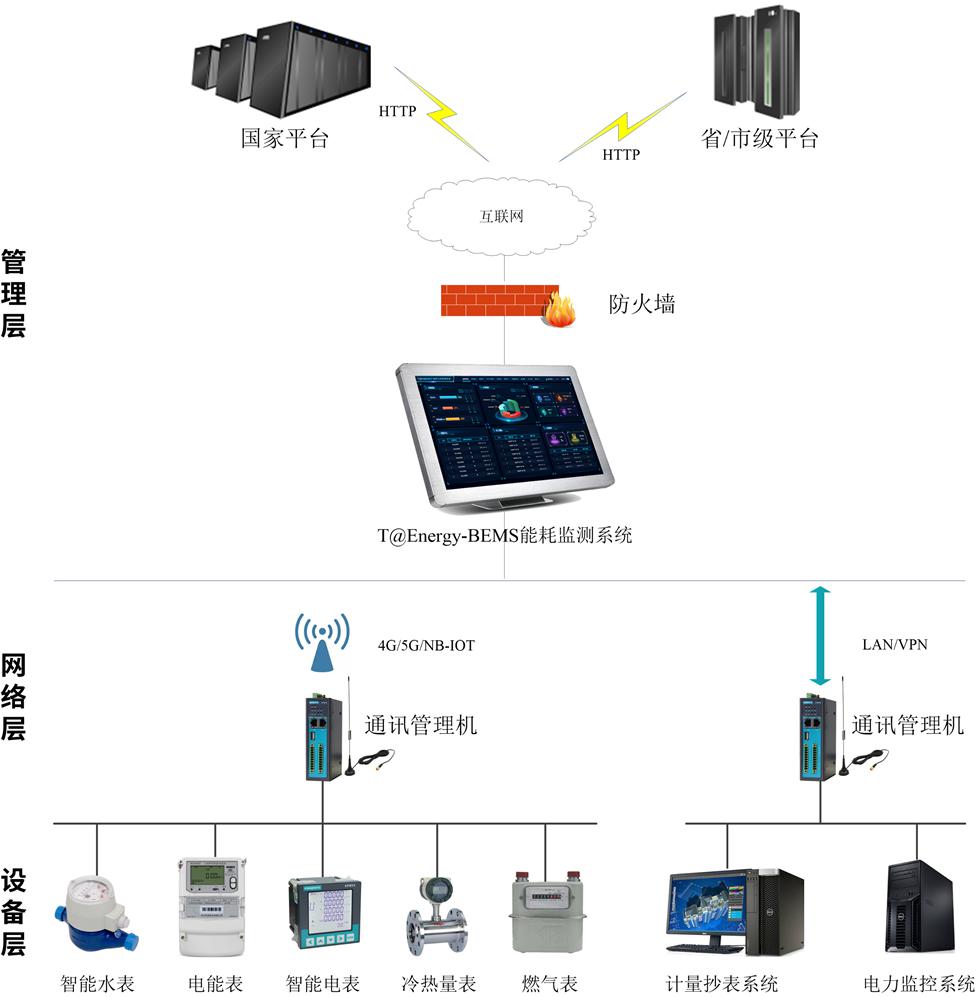网络层:以建筑内部通讯管理机及相关网络线路组成,通讯管理机用于末端计量表计和第三方监测系统内能耗数据的采集、存储、协议转换并上传至“能耗管理一体机”。根据监测点位的数量和位置不同,可任意扩展通讯管理机的数量。