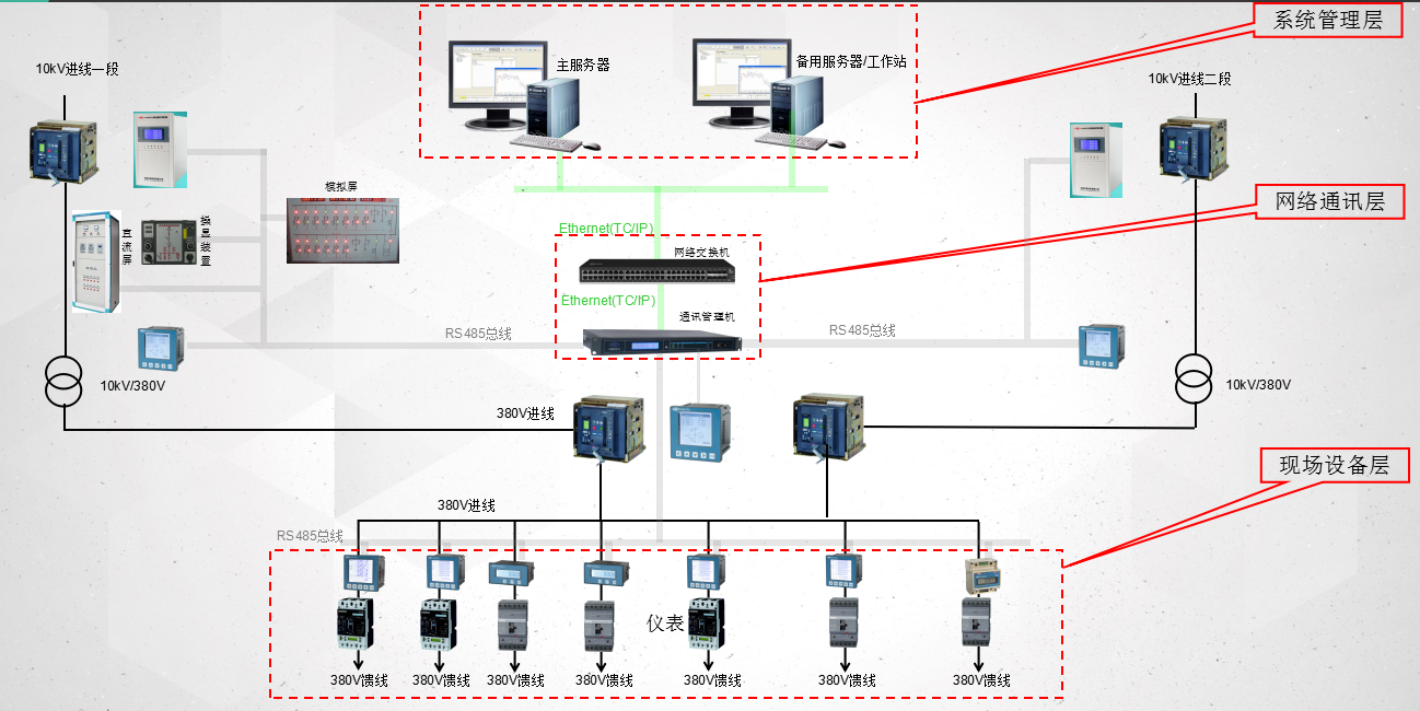 澳门金沙娱乐官网的电能管理系统主要应用于35kV及其以下电压等级的变配电室。电网中对电压等级的分类:中压是指35kV 、10kV、低压是指660V、380V。在电能管理系统中,系统根据功能与结构可划分为三层,分别是系统管理层、网络通讯层、现场设备层。