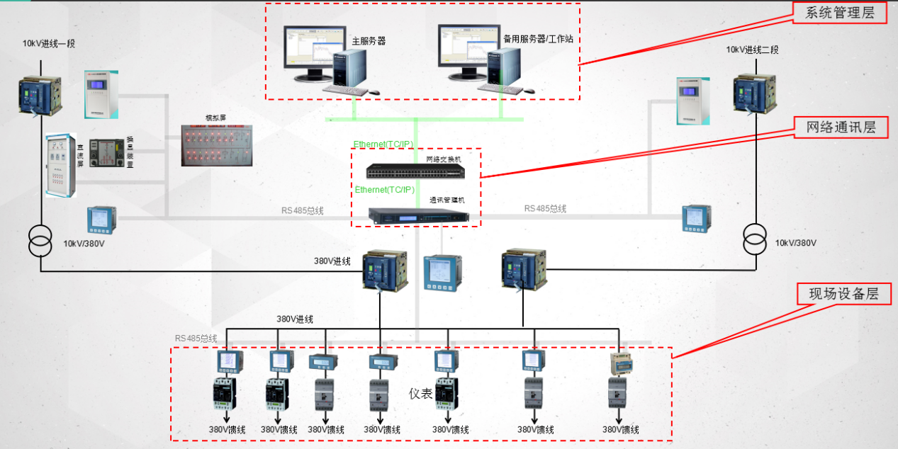 澳门金沙娱乐官网的电能管理系统主要分为三层分别为:系统管理层、网络通讯层、现场设备层。