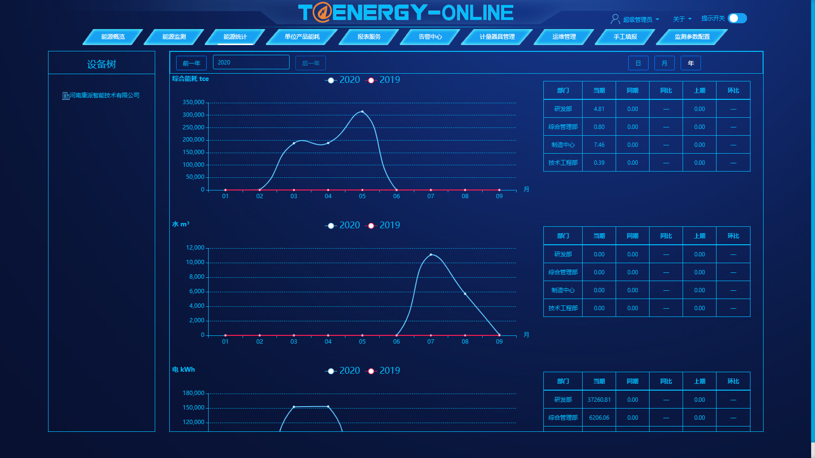 例如首屏可以针对园区中多种能源介质种类进行展示集中展现,能够进行实时更新,从而能够对某个区域、大楼、部门等用能评估,并能够提出节能方案。
