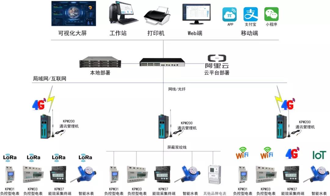 预付费电能管理系统采用分层分布式结构,前端使用智能电表等计量设备实时监测用电数据,通讯管理机将数据上传至云平台/本地服务器进行数据加密处理,通过云平台/本地服务器将加密数据上传至预付费系统后台,实现线上仪表与监控主机的数据连通,完成电能管理系统和收费管理系统功能。